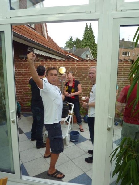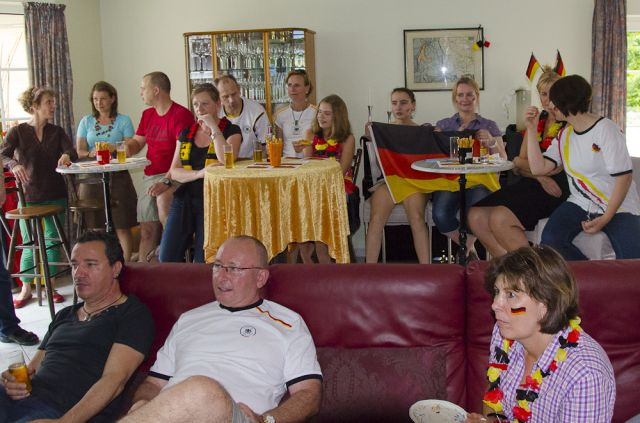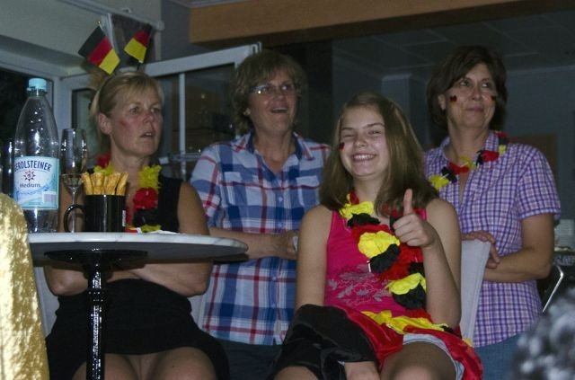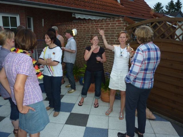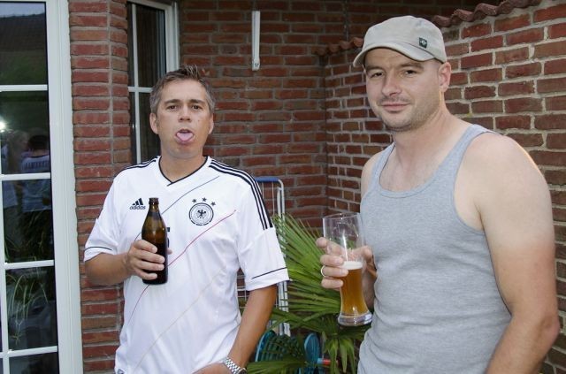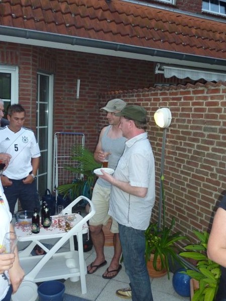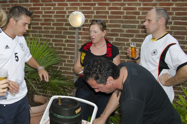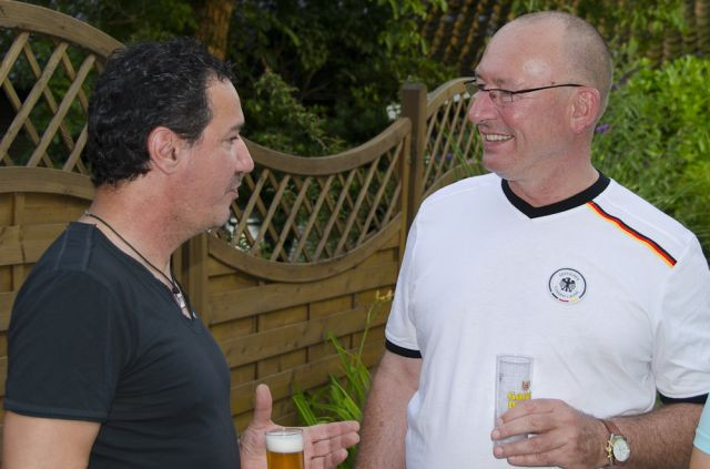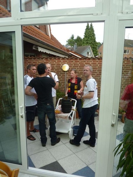 Halbfinale Deutschland – Italien….fast noch 28° und wir bei Bettina und Hartmut (und Frank ist bei dieser EM erstmalig auch dabei – dazu später). Das Fass Mühlenkölsch und die anderen Leckereien waren perfekt und die Stimmung auch. Wie immer bei diesen Temperaturen verdampfte der Inhalt des Fäßchens schnell. Leider kompensierte das Spiel diese fast perfekte Welt ein wenig und die Gesichter wurden länger und länger. Am Ende wurde die deutsche Elf verdient versenkt.