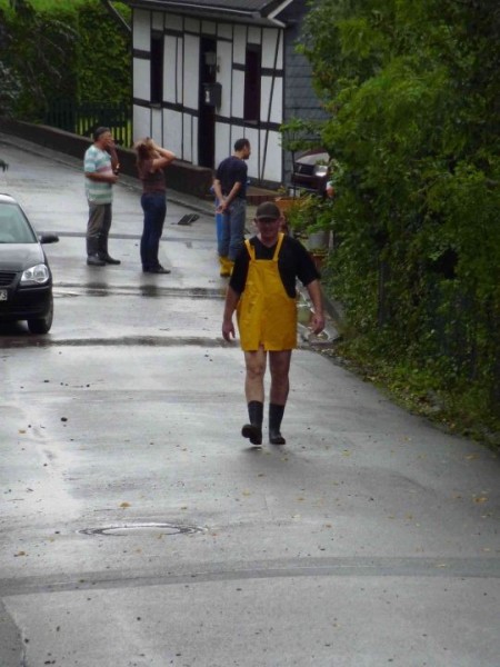 Hui - da kam was runter. Innerhalb kürzester Zeit fielen gut 70 Liter pro Quadratmeter Regen. Und die nahmen so manche Gullies nicht mehr auf - wohl aber der ein oder andere Keller, der Teich, die Baustellen und die gebündelten Wassermassen sorgten für einen neuen Teich bei Stefan. Action war angesagt ....