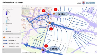 Es wird deutlich, dass es drei Hauptwasserströme gibt – zwei davon betreffen den südlichen Hülstrung unmittelbar. Der südlichere fließt direkt nach Unterberg und führt dort regelmäßig zu Schäden.