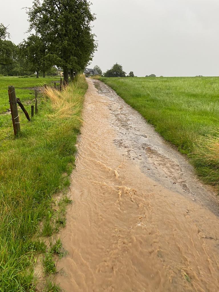 Landwirtschaftsweg aus den höher gelegenen Feldern in Richtung Hülstrung. Der konnte bis dahin von den neuen Gullys und den Randsteinen zunächst noch bewältigt werden. Das änderte sich dann gegen