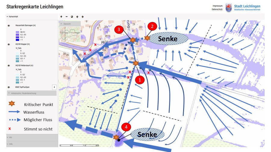 Wie für alle anderen Stadtgebiete gibt es bei der Stadt für den Hülstrung eine Starkregenkarte. Wie die Ereignisse in 2018 und 2021 gezeigt haben berücksichtigt diese die Fließgeschwindigkeiten nur unzureichend und ist somit in Teilen nicht richtig. Diese Karte ist auf der nachfolgenden Grafik durch die Wasserströme ergänzt und die kritischen Punkte vermerkt.