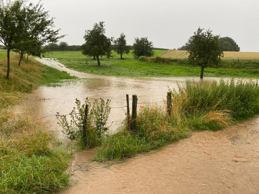 Bis zum Einsetzen der dauerhaften Starkregens um 15:30 Uhr waren die Felder bereits vollständig gesättigt und konnten kein Wasser mehr aufnehmen. Weiterhin haben sich erhebliche Wassermengen in den Senken hinter dem Haus Hülstrung 35 und der weiter außen liegenden Senke gesammelt.