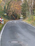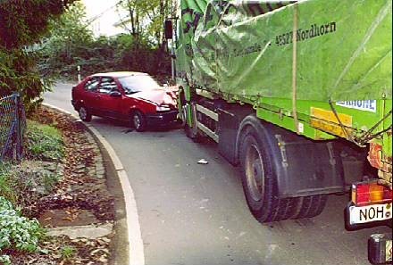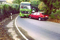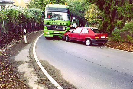 Hier als Fußgänger bei Tag lang zu laufen ist schon was für Waghalsige, denn wie ein Bild zeigt schneiden viele Autofahrer die engen uneinsehbaren Kurven - was würde passieren, wenn dem blauen Wagen ein anderes Fahrzeug entgegen kommt zeigen die Unfallbilder. Fußgänger haben hier keine Chance.